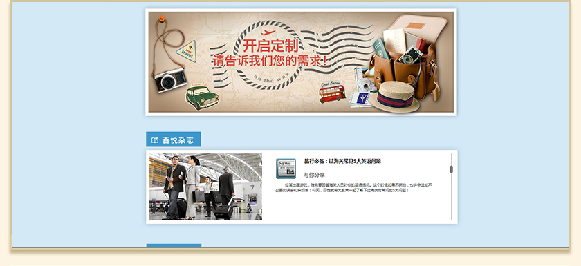 Project Description 百悦逸游于2012年初由二位资深的旅行家创办,是成都传媒集团旗下成都新闻国际旅行社有限公司的高端旅游品牌,总部位于成都高新区天府大道中段美年广场。在百悦逸游成立之前,创始团队亲自到全球三十多个国家实地考察,带着第一手的资讯和执着的信念创立了中国西部第一家真正意义上的私人定制旅行机构。百悦的旅行不是跟团挤大巴,不是十天去十个国家,更不是没完没了的... Official website address 巫溪http://www.100.travel I want to share